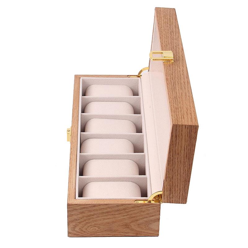 En vacker klockbox i ljust ekfärgat trä. Denna modell tar upp till 6 st klockor och är ett måste för klockentusiasten. Fina detaljer med knäpplås och gångjärn i guldfärgad metall. Toppen är i genomskinligt glas så du får bra översyn över klockorna i stängt läge.